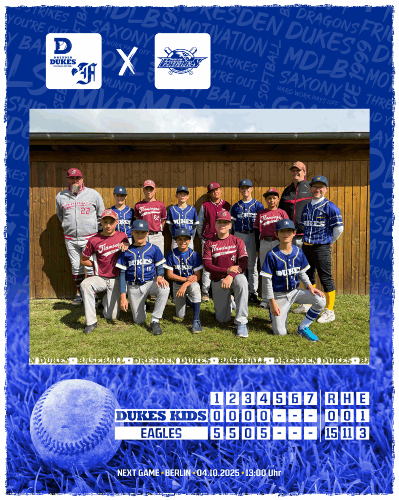 Die Defense stand wie gewohnt sicher hinter unseren Pitcherinnen. Lediglich im zweiten Inning mussten wir die vier Runs der Gegener*innen zulassen. Nach 1h 17min hieß es bereits „Ball Game“ und das Spiel endete mit 5:4 für die Dukes. Somit beenden wir die Saison mit acht Siegen und drei Niederlagen. Im Anschluss fand noch ein Freundschaftsspiel statt, bei dem die Teams bunt gemischt wurden, um zwei gleichstarke Teams zu bilden. Hier durften dann auch unsere Herren, welche im Laufe der Saison eher wenig Einsatz bekamen, mitspielen.
